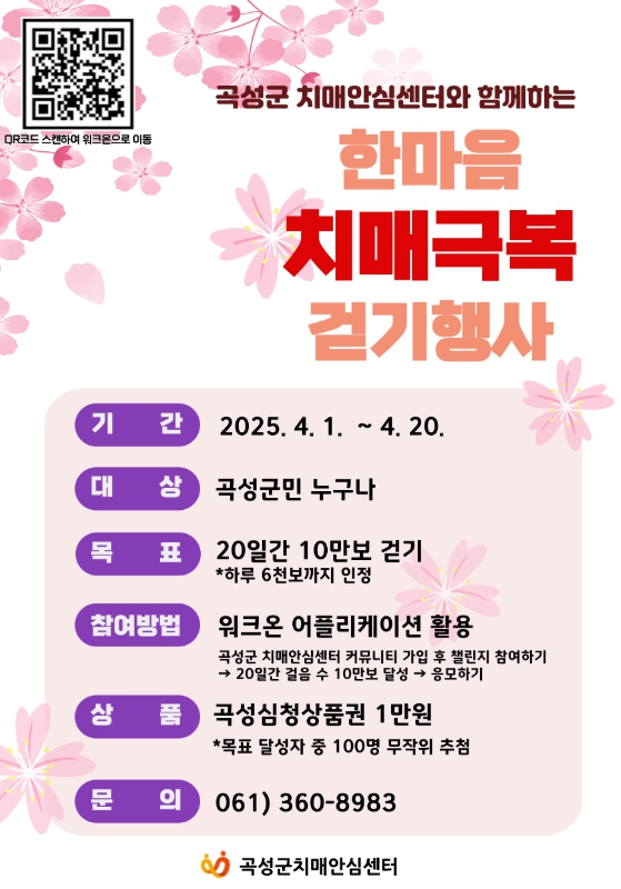 참여를 원하는 주민은 모바일 애플리케이션 ‘워크온’을 다운로드한 뒤, ‘곡성군치매안심센터’ 커뮤니티에 가입해 챌린지에 참여하면 된다. 목표 걸음 수는 20일간 10만 보로, 하루 최대 6,000보까지 인정된다. 이는 무리한 운동을 방지하면서도 지속적인 걷기 실천을 유도하기 위함이다. 기한 내 목표를 달성한 참가자 중 100명을 무작위로 추첨해 모바일 곡성심청상품권 1만 원권을 지급한다.