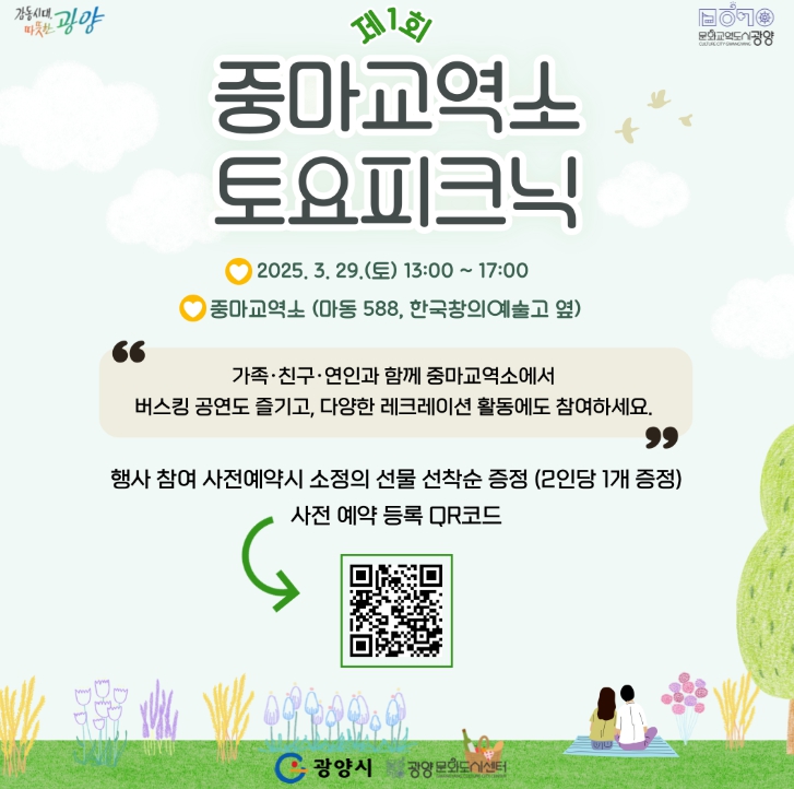 2025년 상반기 〈토요피크닉〉은 3월 29일을 시작으로 7월 12일까지 매월 둘째주, 넷째주 토요일에 중마교역소에서 진행된다.