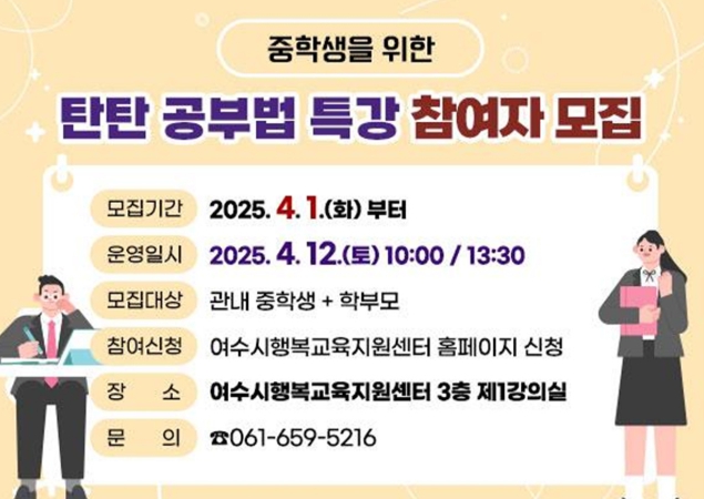 시 관계자는 “수업부터 시험까지 성적에 대해 고민 있는 중학생들이 자신의 공부 방법을 개선하는 시간이 될 것”이며 “특강에서 제공되는 현실적인 공부법으로 성적 향상에 도움이 되길 바란다”고 말했다.