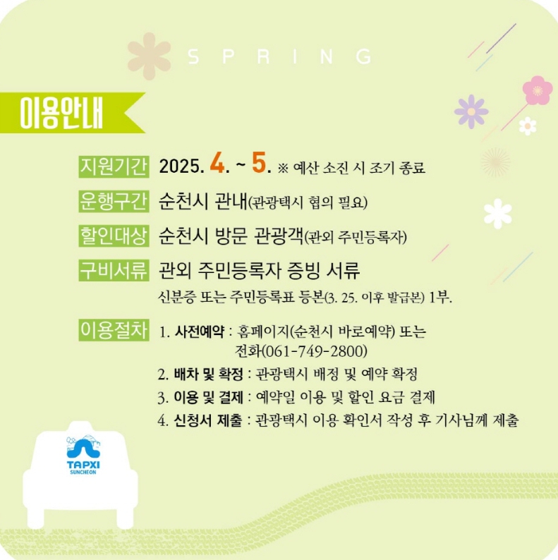 시 관계자는 “이번 봄맞이 순천 관광택시 반값 이벤트를 통해 더 많은 관광객이 순천을 방문하고, 아름다운 봄의 정취를 만끽할 수 있기를 바란다”며, “순천의 다채로운 봄 풍경을 경험하며 특별한 추억을 만드시길 바란다”고 전했다.