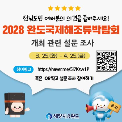 군 관계자는 “설문조사는 2028완도국제해조류박람회의 국제 행사 승인과 성공 개최를 위한 전략 수립의 기반이 될 것이다”면서 “도민 여러분의 적극적인 참여를 부탁드린다”라고 말했다.