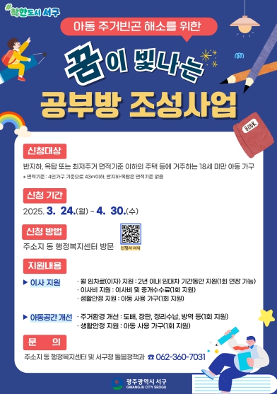 박용금 돌봄정책과장은 “서구에서 자라는 아이들은 쾌적한 주거환경에서 성장할 수 있는 주거권을 누리며 자신만의 꿈을 키울 수 있는 ‘공부방’을 가졌으면 좋겠다는 마음으로 이 사업을 추진하게 됐다”며 “대상자들과 주변의 많은 관심과 적극적인 신청을 바란다”고 말했다.