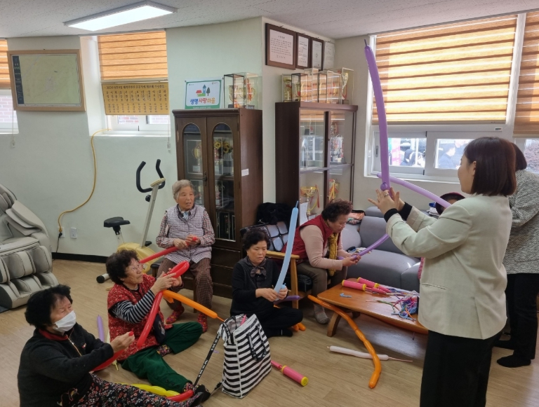 이날 마을회관 실내에서 실시한 군민활력증진 프로그램 중 하나인 ‘풍선아트 공예’가 주민들의 많은 관심을 받았다.