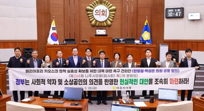 나주시의회는 이번 건의안 통해 ▲배리어프리 키오스크 의무화 시행으로 인한 소상공인의 경제적 부담을 완화할 수 있는 대책을 조속히 마련하고, ▲장애인 단체 등 현장 의견을 반영하여 사회적 약자의 접근성 확보를 위한 조치를 우선적으로 추진할 것을 촉구했다.