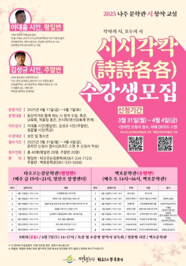 나주시는 4월부터 타오르는강 문학관, 백호문학관에서 ‘시인과 함께하는 시 창작 교실’을 운영한다고 28일 밝혔다.