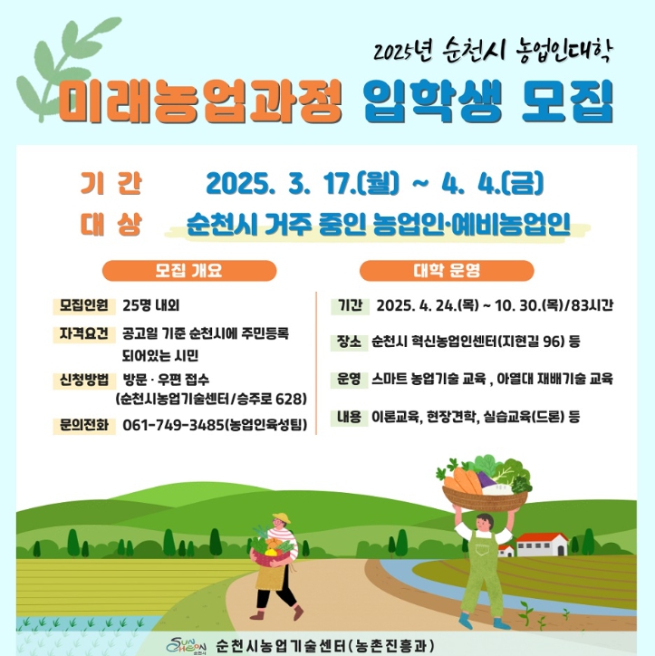 2025년 순천시 농업인대학 미래농업과정은 4월 24일 입학식을 시작으로 10월 30일까지 스마트농업 기술교육 및 아열대 재배기술 교육을 21회(83시간) 실시한다.