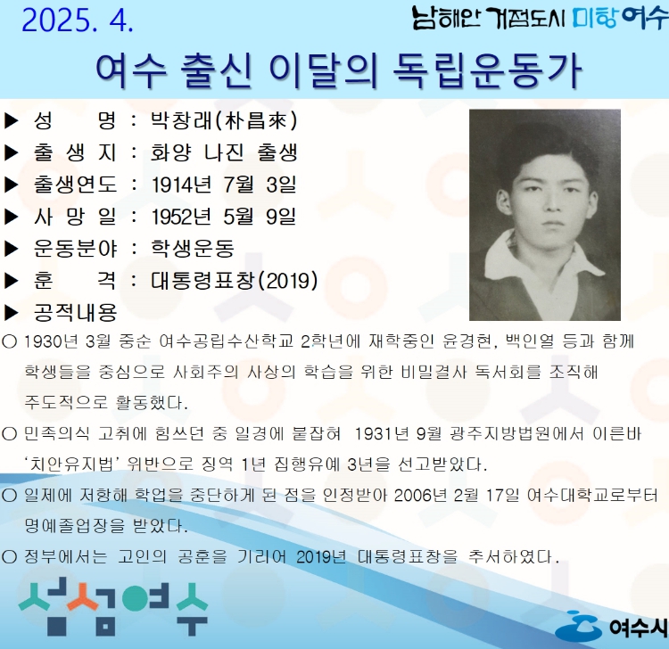 박창래 선생은 1914년 7월 3일 태어나 1930년 3월 중순 여수공립수산학교 2학년에 재학 중인 윤경현, 백인열 등과 함께 사회주의 사상의 학습을 위한 비밀결사 독서회를 조직해 주도적으로 활동했다.