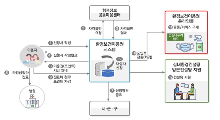 ‘환경보건이용권’은 물품 및 서비스를 구매할 수 있는 10만원 상당의 ‘상품·서비스·진료비 이용권’과 실내환경 방문 컨설팅 및 필요 시 장판·벽지 교체를 지원하는 ‘실내환경 컨설팅 이용권’으로 나뉜다.