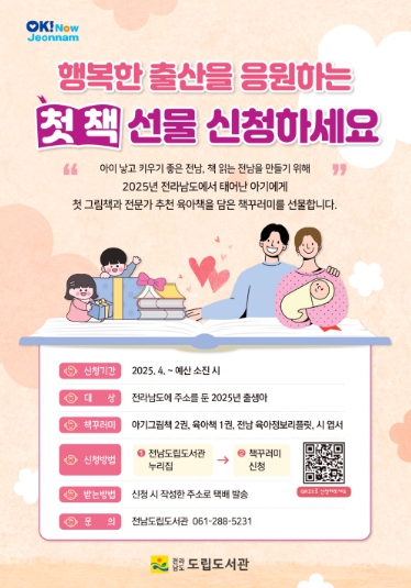 사업 대상은 전남에 주소지를 둔 2025년 출생아다. 아기 발달단계에 맞는 그림책 2권과 육아와 도서 전문가가 선정한 양육자책 1권을 담은 책 꾸러미를 신청 가정으로 배부할 계획이다. 꾸러미에는 전남도 출산육아지원 정보 안내문과 육아에 지친 양육자에게 위로가 되는 한강 작가의 ‘괜찮아’ 시가 담긴 엽서를 함께 제공한다.