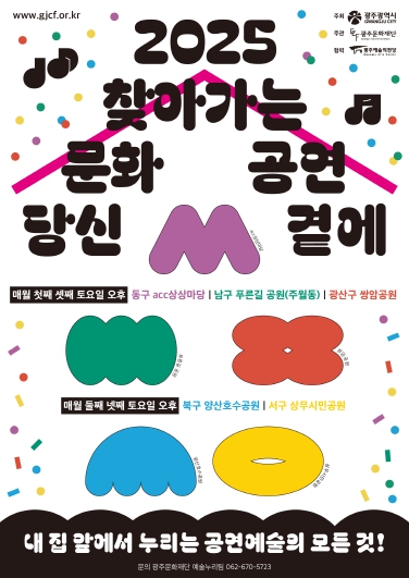 광주광역시는 4월부터 11월까지 매주 토요일 동구 국립아시아문화전당(ACC) 상상마당, 서구 상무시민공원, 남구 푸른길공원, 북구 양산호수공원, 광산구 쌍암공원 등 5곳에서 ‘찾아가는 문화공연’을 연다.
