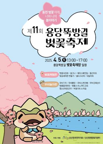 올해로 11회째를 맞은 벚꽃축제는 봄바람과 함께 만개한 용당뚝방길 벚꽃을 배경으로 ‘동천 벚꽃 아래, 너와 나의 봄 이야기’를 주제로 13시부터 17시까지 진행된다.