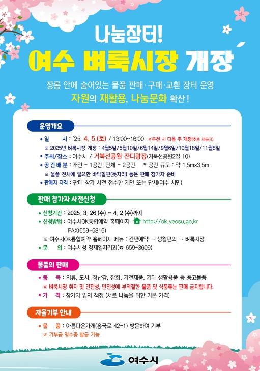 시 관계자는 “2013년부터 10년 넘게 나눔문화 확산과 이웃 간 소통의 장으로 꾸준히 사랑받은 여수 벼룩시장에 시민들의 많은 관심과 참여를 바란다”고 말했다.
