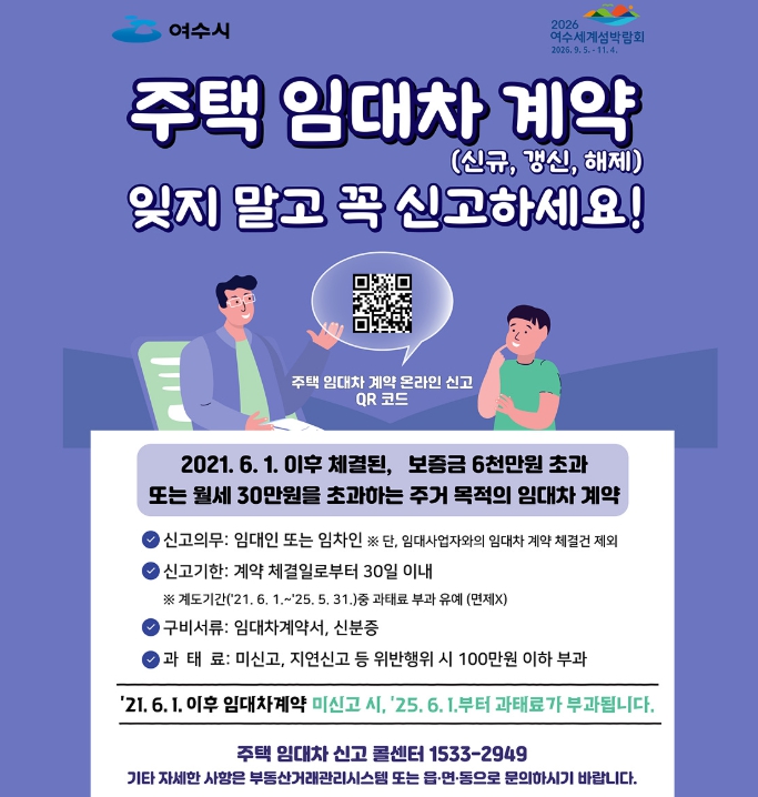 신고 대상은 2021년 6월 1일 이후 체결된 보증금 6,000만 원 또는 월세 30만 원을 초과하는 주거 목적의 주택 임대차 계약이다.