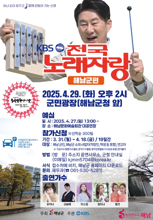 한편 군 관계자는“지난 2023년 이후 2년 만에 해남에서 열릴 전국노래자랑이 해남의 멋과 맛을 전국에 자랑하고, 군민소통과 화합의 무대가 될 수 있도록 준비에 최선을 다하겠다”고 전했다.