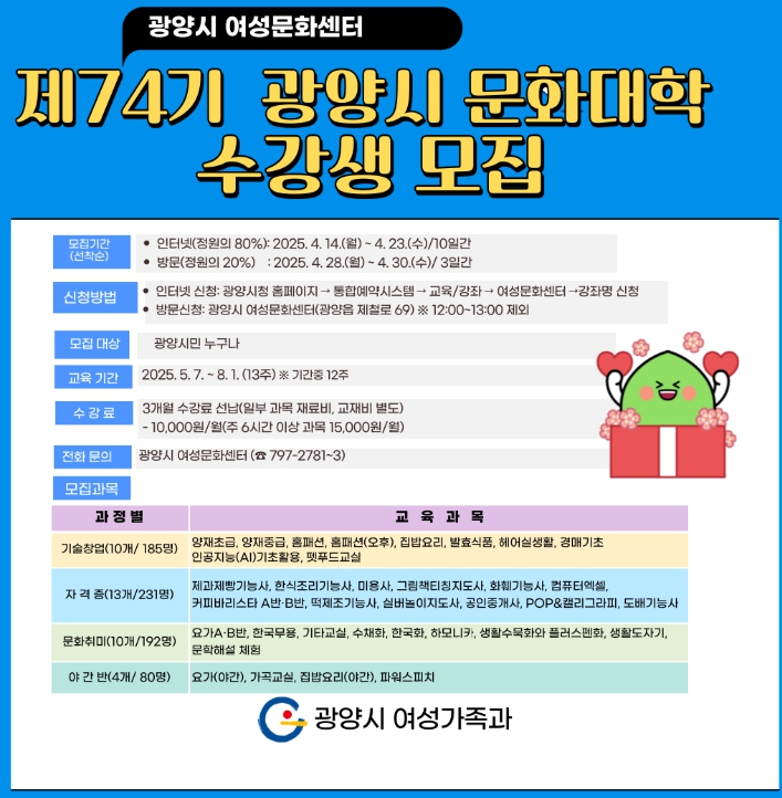 문화대학 프로그램은 광양시 거주자라면 남녀 구분 없이 누구나 수강할 수 있다.
