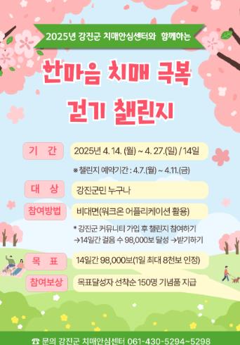 참여와 관련하여 기타 궁금한 사항은 강진군치매안심센터으로 문의하면 된다.