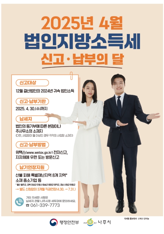 법인은 사업연도 종료일로부터 4개월 이내인 오는 30일까지 관할 자치단체에 과세표준 및 세액신고서, 기타 첨부서류를 제출하고 법인지방소득세를 납부해야 한다. 세액이 100만 원을 초과하면 중소기업은 최대 2개월, 일반 법인은 1개월까지 분할납부가 가능하다.