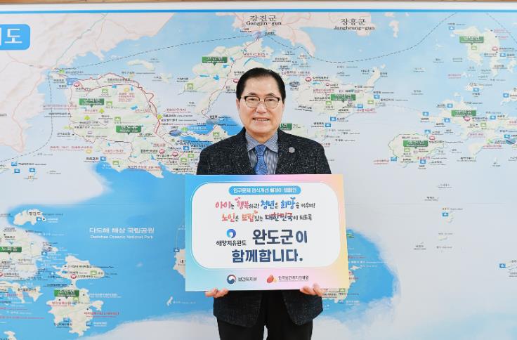 신우철 군수는 ‘아이는 행복하고, 청년은 희망을 키우며, 노인은 보람 있는 대한민국이 되도록 완도군이 함께합니다’라는 선언문이 적힌 팻말을 들고 캠페인 참여를 인증했다.
