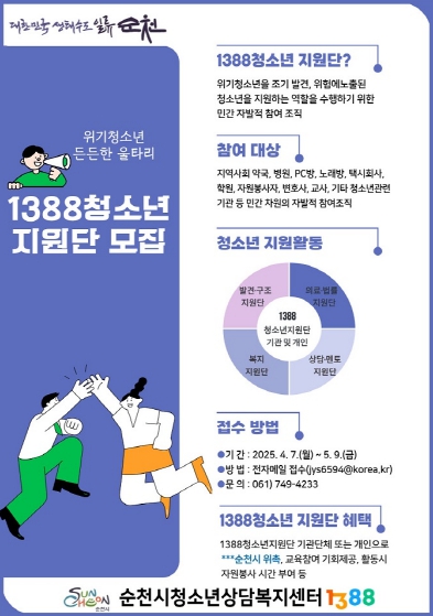 청소년에 대한 사랑과 관심이 있고, 순천에 거주하는 개인 또는 단체라면 누구든지 참여 가능하며, 가입신청은 오는 5월 9일까지 순천시청 누리집 고시/공고란을 통해 신청서를 확인 후, 전자메일로 접수하면 된다.