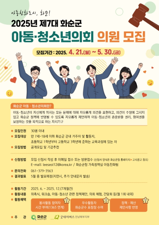 제7대 아동·청소년의회 의원을 선발하여 ▲6월 아동 권리 교육 이수를 시작으로 ▲7월 위촉식 ▲8~ 9월 정기 의회 및 정책 제안 활동 ▲11월 간담회와 모의의회 체험 ▲12월 해촉식까지 다양한 의정활동 체험 프로그램과 교육 등의 참여기회가 제공되며, 봉사 활동자에게 봉사 시간 부여 및 우수 활동자에게는 화순군수 표창 등의 혜택이 주어진다.