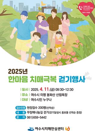 한편, 여수시 치매안심센터는 △치매 조기 검진 △치매 환자 쉼터 및 가족 교실 △치매 치료관리비 지원 △조호물품 제공 △치매 인식개선 홍보 및 켐페인 등의 사업을 지속 추진하고 있다.