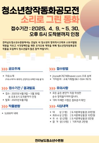 이춘복 원장은 “이번 공모전이 청소년들에게 창작 경험과 역량 강화를 위한 좋은 발판이 되길 바란다”며, “앞으로도 전남 지역 청소년을 위한 다양한 공모전을 지속적으로 개최할 계획"이라고 전했다.