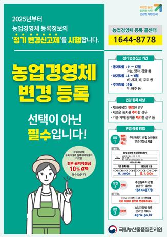 농관원에서는 “경영체 등록정보의 정확도를 높이려면 농업인의 적극적인 참여가 필수적”임을 강조하며, “재배품목이나 농지가 변경되면 이번 정기 변경 신고기간에 꼭 신고해 달라”고 당부했다.