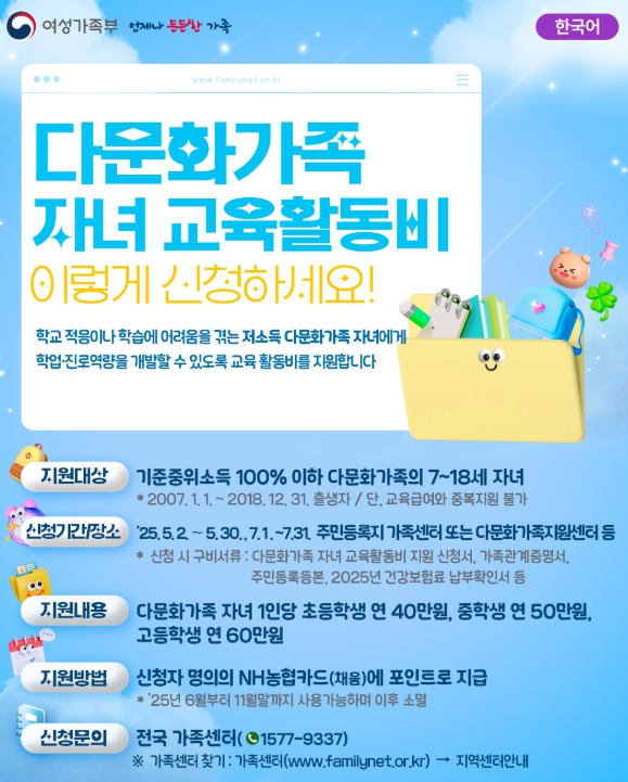 조미화 인구청년정책과장은 “이번 지원이 다문화가족 자녀들의 교육 기회 확대와 학습 의욕 향상에 실질적인 도움이 되기를 바란다”라며, “신청 기간 내 대상 가정이 빠짐없이 신청할 수 있도록 학교, 청소년 기관, 다문화 커뮤니티와 함께 적극적으로 홍보하겠다”라고 밝혔다.
