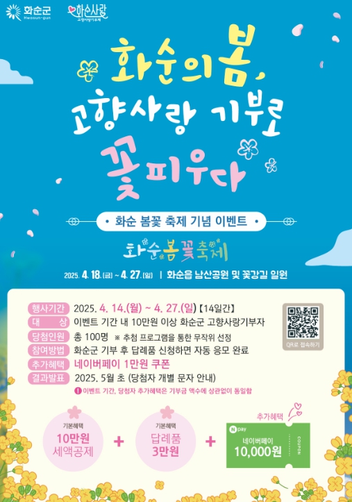 구복규 화순군수는 “마음까지 따스해지는 4월의 봄날, 아름다운 화순을 찾은 분들께 고향사랑기부제를 홍보할 좋은 기회”라며, “기부를 통해 고향을 응원하고, 추가 혜택도 누릴 수 있는 이번 행사에 많은 관심과 참여를 부탁드린다”라고 말했다.