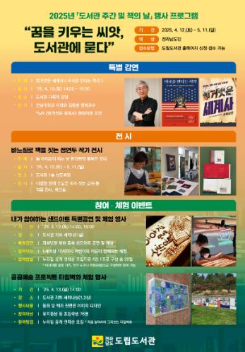 도서관 주간 및 책의 날 행사에 관한 자세한 사항은 전남도립도서관 누리집에서 확인하거나 전화로 문의하면 된다.