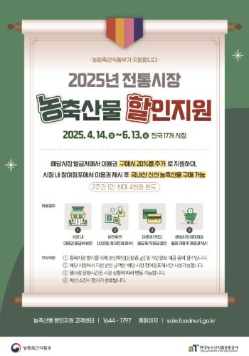 사업 추진 시 민원을 최소화하기 위해 전담 인력이 시장에 상주해 전용카드 충전 및 사업 추진 시 애로사항을 적극 해소할 예정이다. 자세한 사항은 농식품부 농축산물 할인지원 누리집에서 확인할 수 있다.