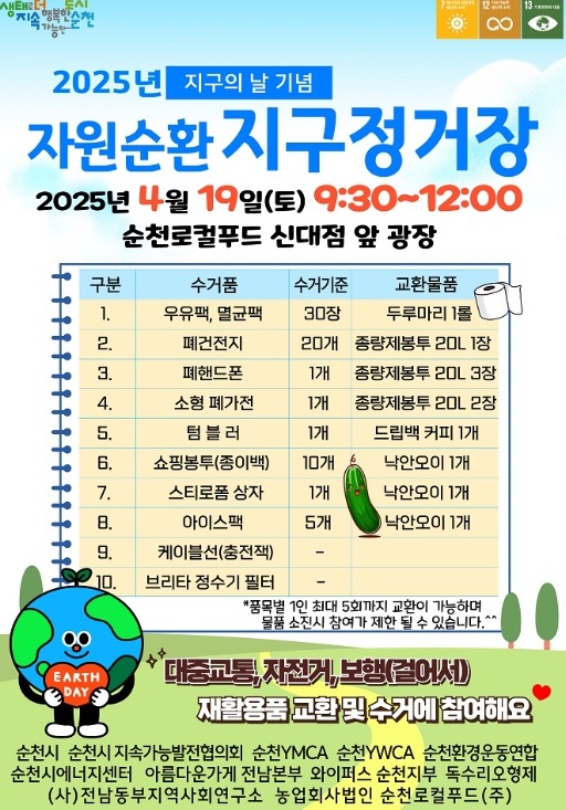 행사 당일 순천로컬푸드 신대점 앞에서는 자원순환 지구 정거장을 운영하여 우유팩, 멸균팩, 폐건전지, 폐핸드폰, 소형 폐가전, 쇼핑봉투(종이가방), 아이스팩 등을 종량제 봉투(20L), 두루마리 휴지, 지역 농산물(오이)로 교환하고 안쓰는 텀블러, 스티로폼 상자를 기부받아 지역 내 노플라스틱 카페와 순천로컬푸드(주)에 기증하여 공유 자원으로 활용할 계획이다.