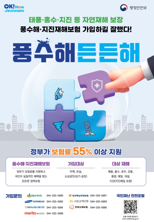 풍수해·지진재해보험 가입 문의는 전남도 자연재난과, 시군 재난관리부서나 읍면동사무소, 풍수해보험 취급보험사인 DB손해보험·현대해상·삼성화재·KB손해보험·NH농협손해보험·한화손해보험·메리츠화재, 소상공인 풍수해·지진재해공제사(KBIZ 중소기업중앙회에 하면 된다.