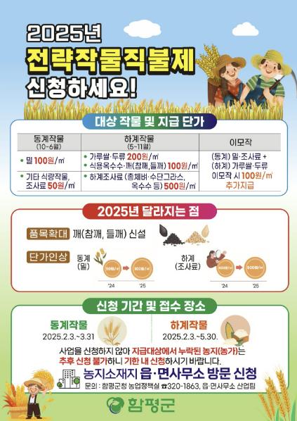함평군은 11일 “전략 작물 직불제(하계작물), 논 타작물 재배 지원사업, 벼 재배면적 조정제도 등 각종 지원을 희망하는 농업인은 오는 5월 30일까지 농지 소재지 관할 읍·면사무소에서 신청할 수 있다”고 밝혔다.