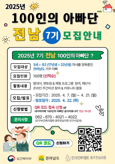100인의 아빠단은 복지부와 전남도, 인구보건복지협회 광주전남지회가 운영하는 저출생 대응 인식개선 사업의 일환이다. 3세부터 초등 2학년 자녀를 둔 전남도 거주 아빠들은 누구나 신청할 수 있다.