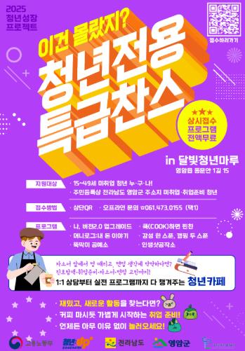 전액 무료로 진행되는 교육 신청은 홍보물의 QR코드에 접속해 구글폼을 작성하면 되고, 프로젝트에 대한 자세한 안내는 영암군청년센터에서 한다.
