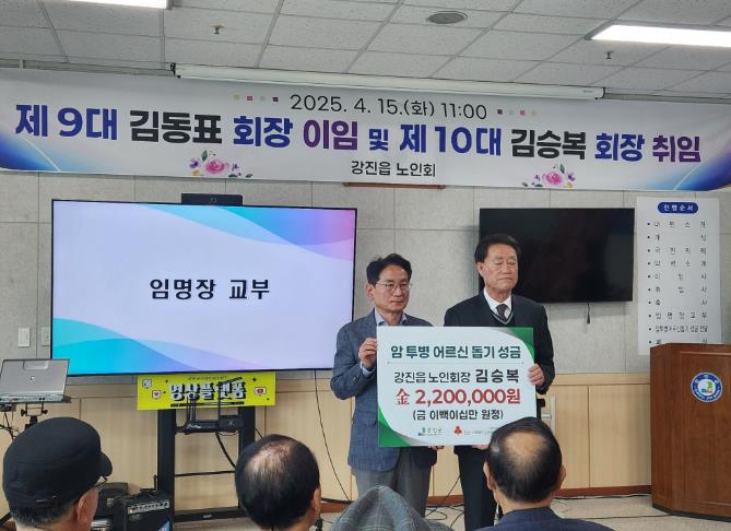 이임하는 김동표 회장은 재임 중 경로당 운영을 내실화하고 어르신 복지 향상에 힘써, 강진읍 노인회의 화합과 발전에 크게 이바지했다,