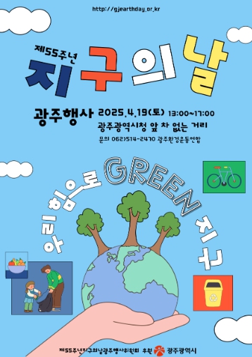 ‘지구의 날’ 기념식은 19일 시청 앞에서 광주지역 70여 환경단체와 유관기관, 시민 등 1000여명이 참여한 가운데 열린다. 행사는 지구의 날 경과보고, 대자보도시 시민실천단 위촉장 수여, 슬로건 시민공모 시상, 퍼포먼스 등으로 진행한다.