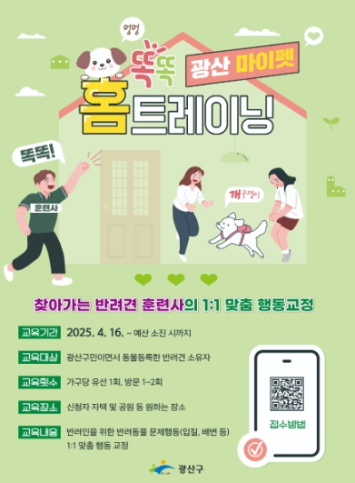 대상자는 광산구에 거주하면서 올바른 돌봄교육이 필요한 반려견 가정이며, 유선 상담과 함께 가구당 1∼2회씩 총 100회의 행동 교정 교육이 진행된다.
