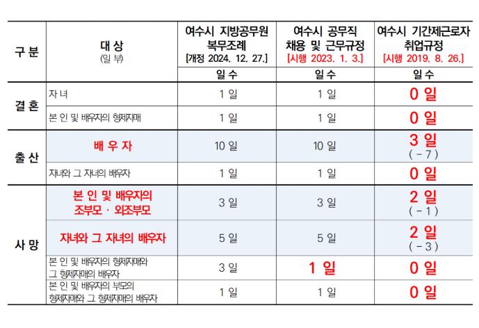 현재 여수시 공직자 별 복무규정에 따르면, 지방공무원은 배우자 출산 시 10일, 자녀 사망 시 5일의 휴가가 보장되며, 공무직 근로자는 자녀 사망 시 공무원과 동일하게 5일이 부여되지만, 기간제근로자는 배우자 출산 시 3일, 자녀 사망 시 2일만 허용되고 있다.