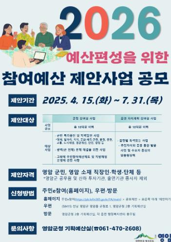 김영중 영암군 기획예산실장은 “주민 스스로 지역 문제를 고민하고 해결하는 것이 참여 민주주의의 핵심이다. 많은 영암군민의 관심과 참여 바란다”고 전했다.