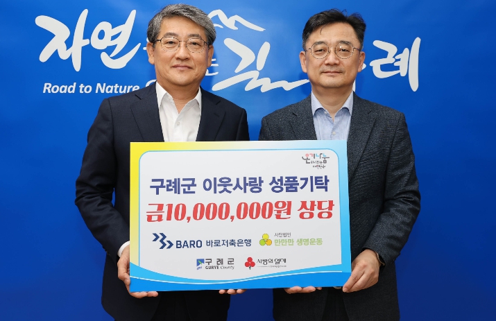 이번 기탁식은 2022년 구례군과 바로저축은행이 체결한 1사1촌 상생 협약의 일환으로 진행됐다. 바로저축은행은 해당 협약을 통해 5년간 총 1억 원 기탁을 약정했으며, 현재까지 7천만 원을 기탁하였다.