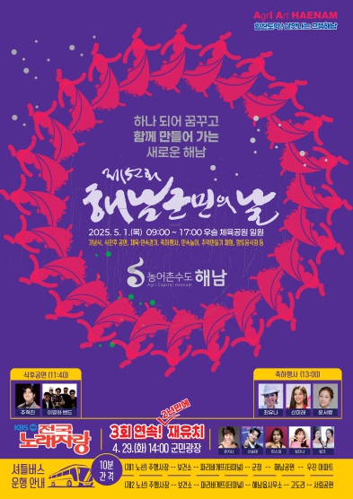 해남군민의 날을 기념해 4월 29일에는 KBS전국노래자랑이 군민광장에서 열린다.