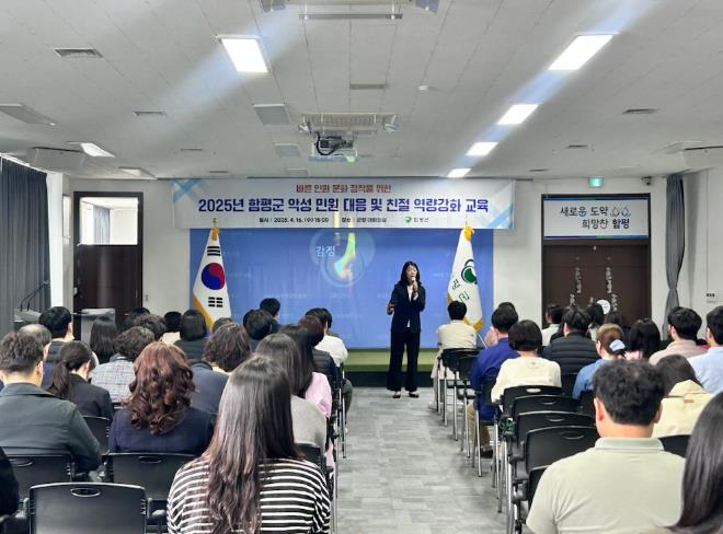 함평군은 18일 “2025년 악성민원 대응 및 친절 역량 강화 교육이 지난 16일 군청 5층 대강당에서 전 직원을 대상으로 진행됐다”고 밝혔다.