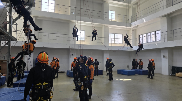 교육은 ▲경사면 하강구조 ▲낮은방향 수직(인양) 구조 기술 숙달 ▲자연, 구조물, 인공 확보 지점 인명구조 등 로프를 활용한 인명구조에 대해 중점적으로 다뤄졌다.