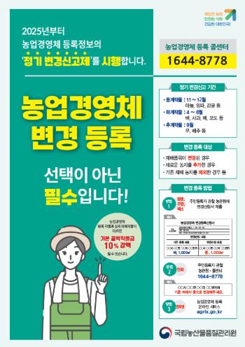 관련 법령상 농업경영체가 변경등록 의무를 이행하지 않으면 기본직접지불금의 10% 감액 대상에 해당하나 올해까지는 계도기간으로 운영하고 내년부터는 직불금 등이 감액될 수 있으므로 농업경영체 등록정보의 변경등록이 필수이다.