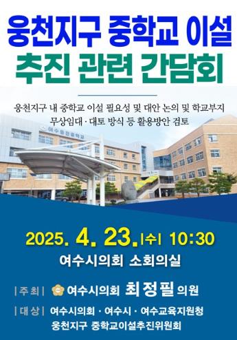 한편, 웅천지구 중학교 이설 문제는 앞서 여수시의회 시정질문 등을 통해 지속 제기된 사안으로, 이번 간담회는 세 기관이 함께 논의하는 의미 있는 자리가 될 것으로 보인다.