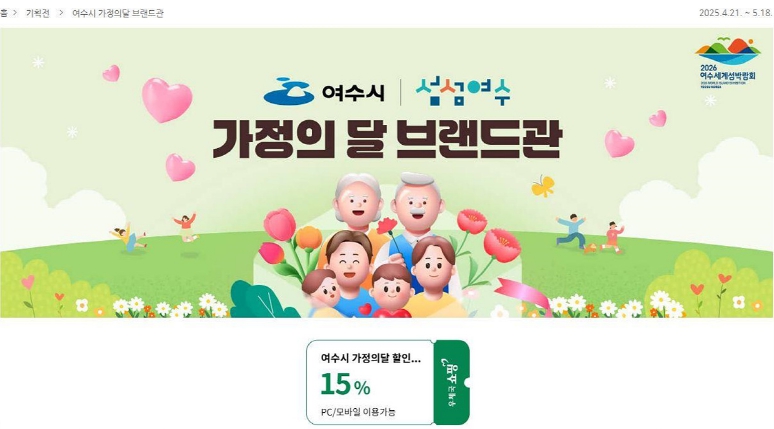 지난 21일부터 시작된 이번 할인행사는 다음 달 18일까지로, 우체국쇼핑몰 내 여수시 브랜드관에서 판매하는 여수시 농수특산품 전 품목에 대해 15% 할인쿠폰을 지급한다.