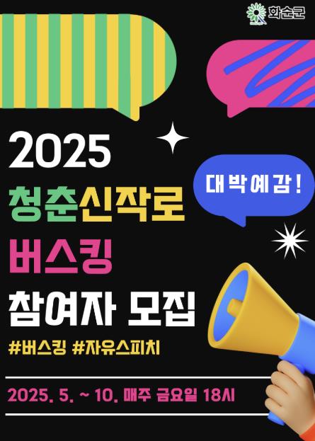 올해 버스킹 공연은 5월 16일(금)을 시작으로 10월까지 매주 금요일 오후 6시에 청춘신작로 어울림광장(화순읍 자치샘로 49-2)에서 진행된다.
