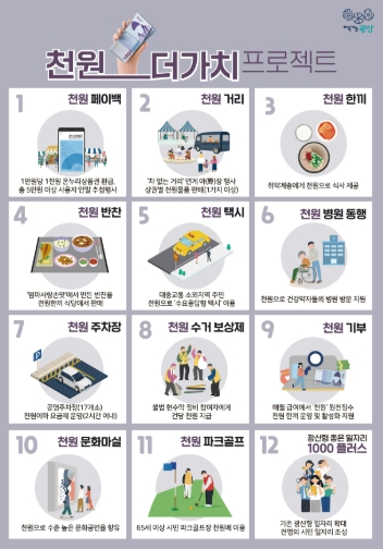 △천원 페이백(환급) △천원거리 △천원한끼 △천원반찬 △천원택시 △천원병원동행 등 1,000원으로 누리고, 혜택을 얻을 수 있는 총 12개의 과제로 추진된다.